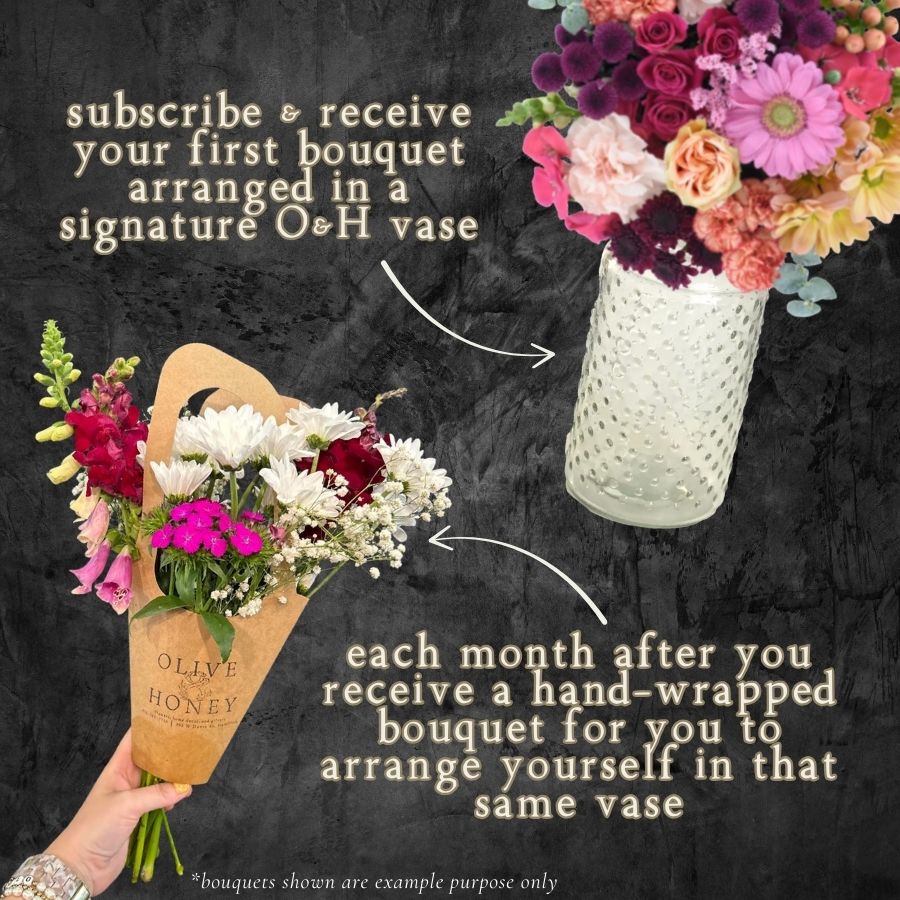The perfect way for flower-lovers to keep fresh blooms in their life regularly at an approachable cost is subscribing to a seasonal, themed bouquet of fresh cut flowers, each and every month! When you subscribe, you’ll receive a signature O&H vase at pick up of your first month’s bouquet. Each month after, we’ll create a fresh, hand-wrapped bouquet designed to fit that same vase—making it easy (and fun) to keep your space in bloom all year long. Pick up date is the 2nd Thursday of the month. A welcome and reminder emails will be sent upon subscribing. Delivery is NOT available for this subscription plan. If you require delivery please consider the (12) month forget-me-not subscription.