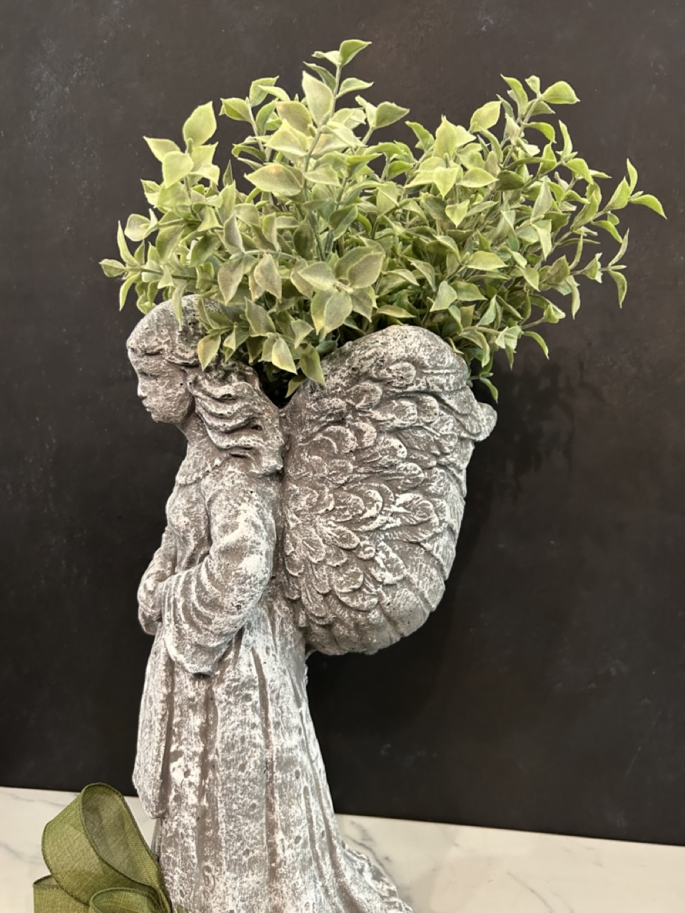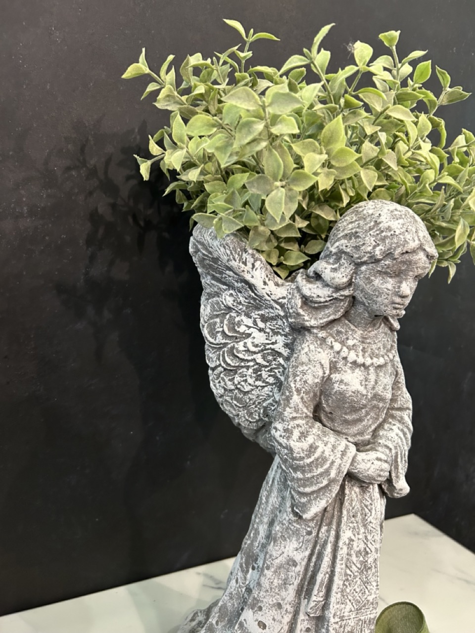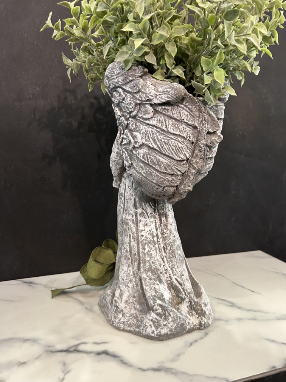 This Concrete Angel Planter showcases a somber angel standing with it's wings forming a small planter on her back. This is perfect for sending to a funeral when you want a keepsake item for the recipient that does not require care or maintenance.