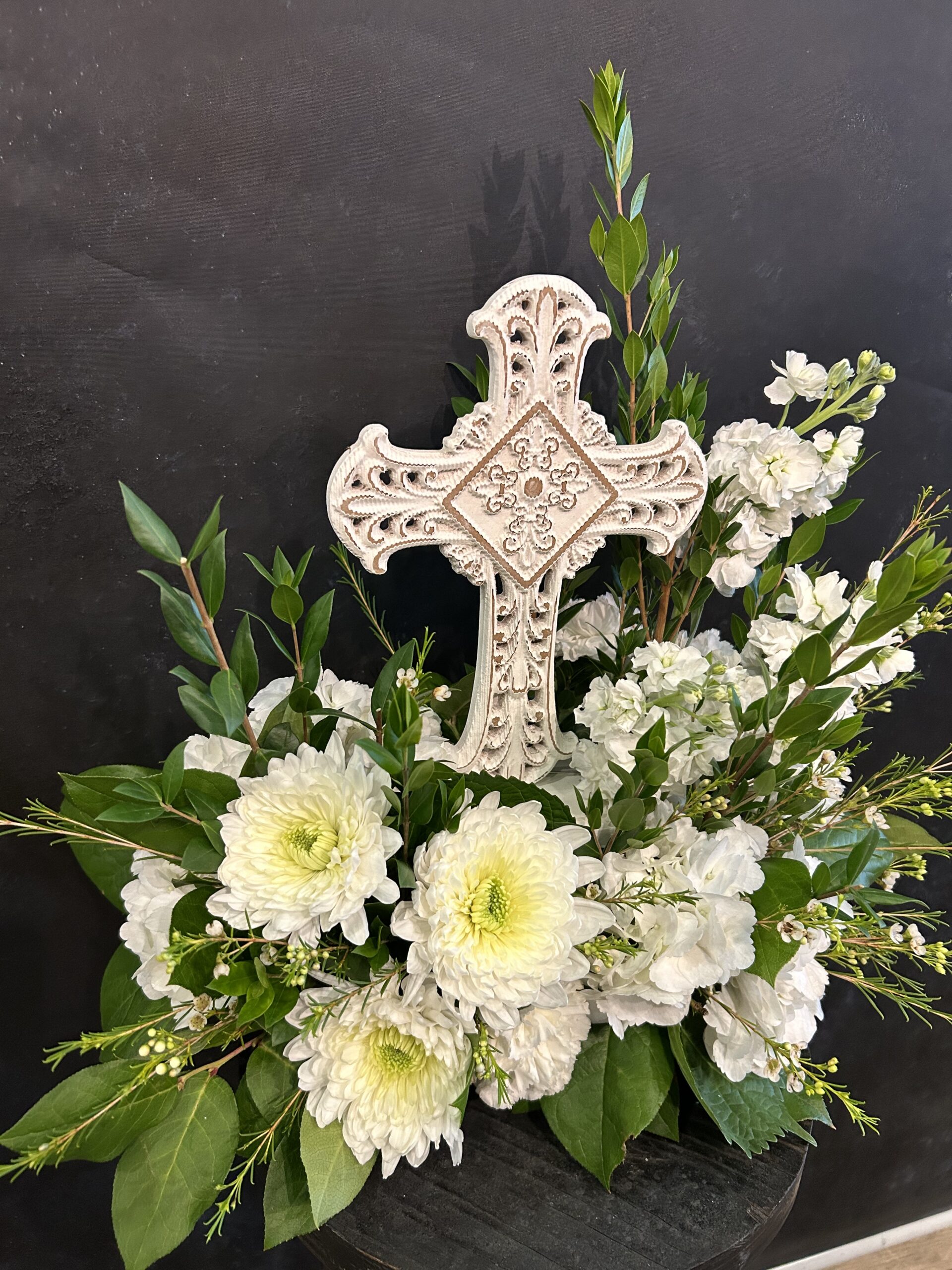 This low, round arrangement offers a serene tribute in all white blooms, symbolizing purity, peace, and remembrance. Designed in a forward-facing style, it features a standing cross nestled at its heart—quietly honoring faith and offering comfort. Soft pops of green add a natural touch, while the compact, lush design brings a gentle presence to any setting. A meaningful expression of sympathy and unwavering love.