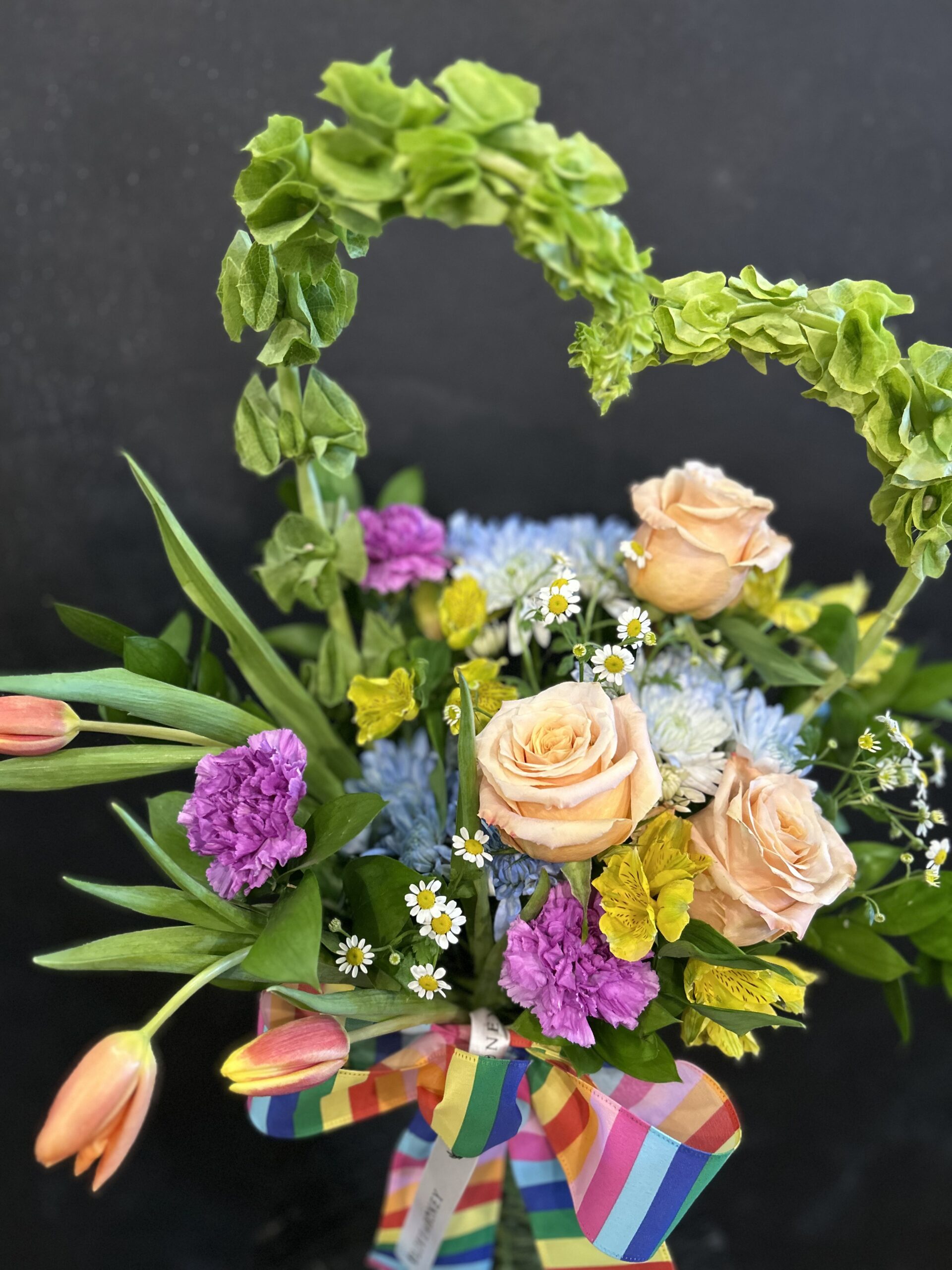 At the center, striking Bells of Ireland are artfully shaped into a heart, making this arrangement not just festive, but full of love and intention. Their vivid green tone brings height, movement, and a bold seasonal statement. Surrounding them are cheerful pops of color — soft peach roses, bright tulips, sunny yellow accents, and playful touches of pink and white — adding warmth and personality against the sea of green.