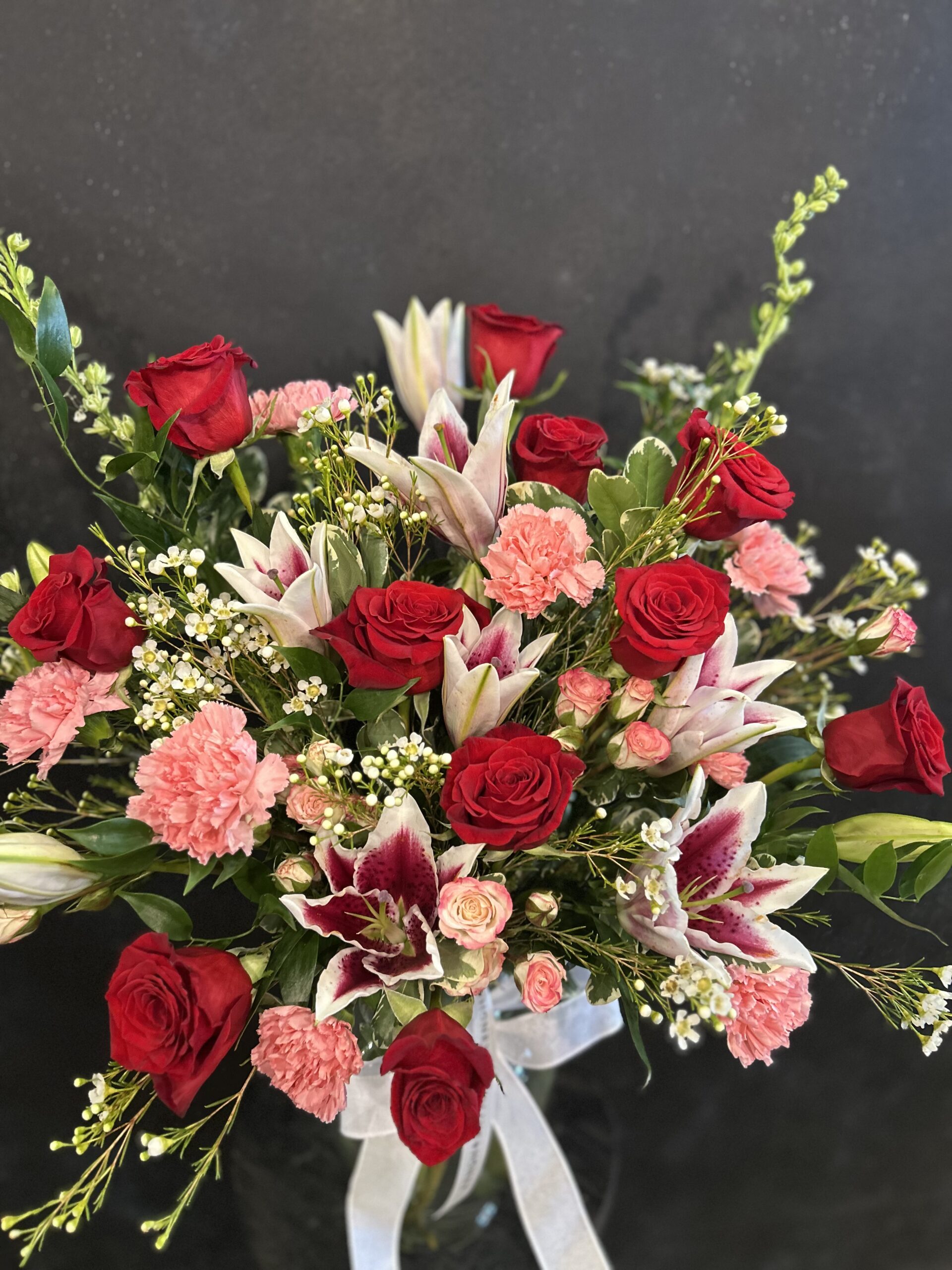 Love You More is a showstopping, large-scale arrangement that blends classic romance with dramatic flair. Deep red roses and vibrant stargazer lilies are paired with hot pink carnations and spray roses for a lush, layered look. Bells of Ireland and Italian ruscus add height and elegance, while delicate baby’s breath weaves throughout for a soft, airy touch. Perfect for making a statement, this arrangement is the ultimate pick to make this anniversary or birthday unforgettable! 💖🌹