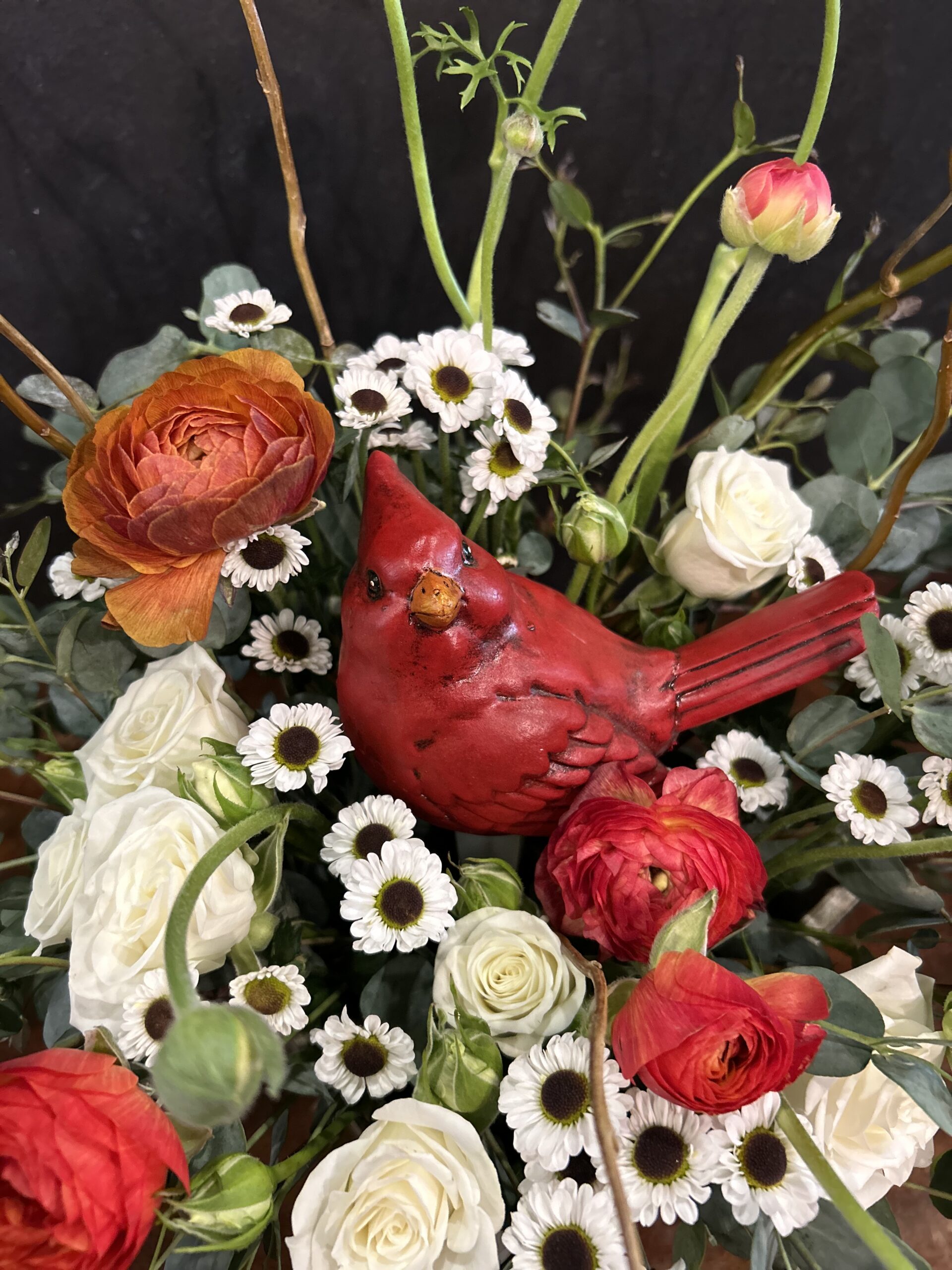 A comforting tribute inspired by the timeless belief that cardinals are messengers of love from those we've lost. Nestled among soft white spray roses, dancing red ranunculus, bold yin-yang poms, and fragrant frosted eucalyptus, a vivid red cardinal rests gently—symbolizing presence, peace, and memory. Curving willow branches rise like prayers toward the sky, adding height and a sense of spiritual grace. Set in a rustic wooden box, this arrangement offers warmth, beauty, and a gentle reminder that we are never truly alone.