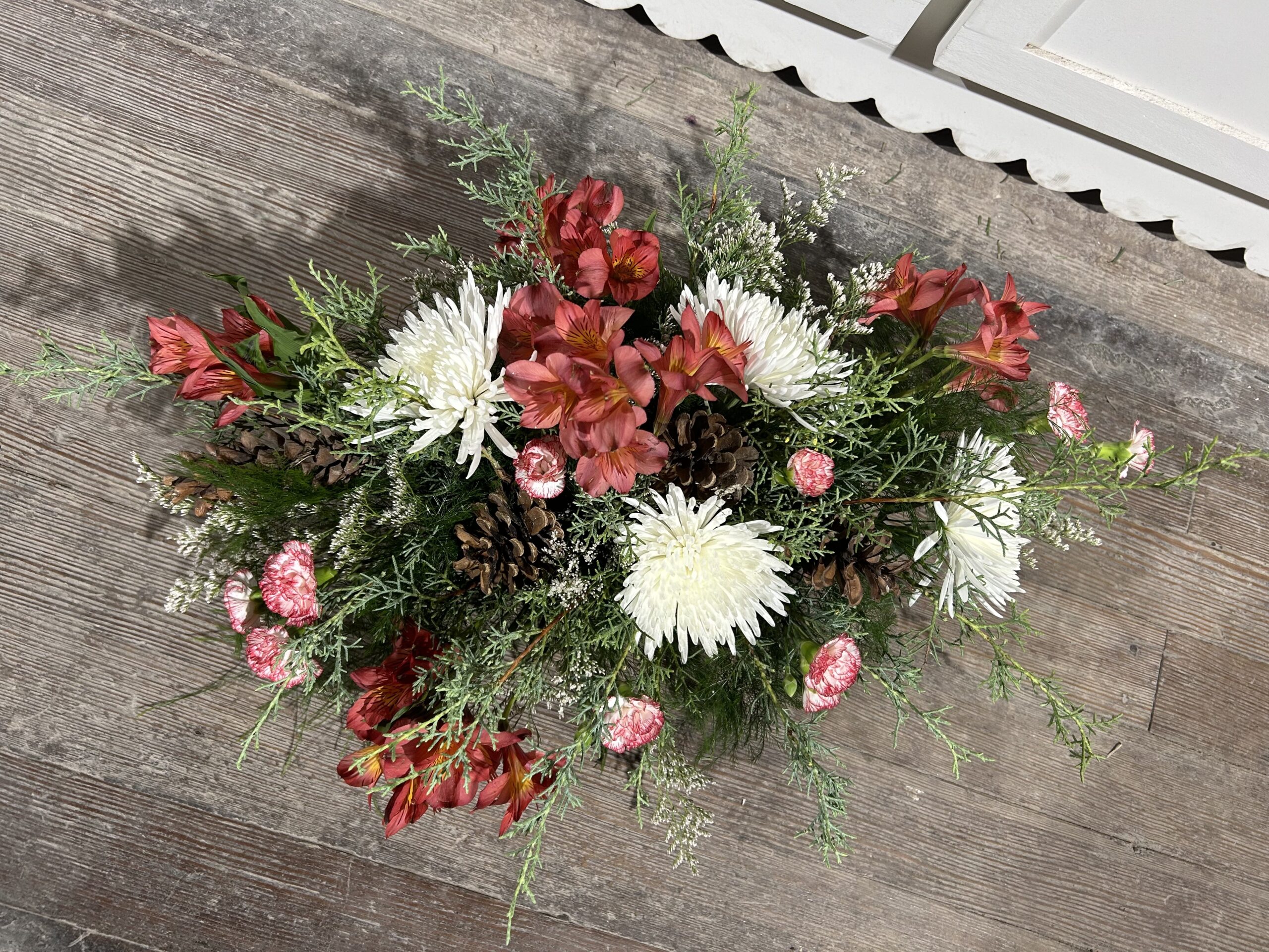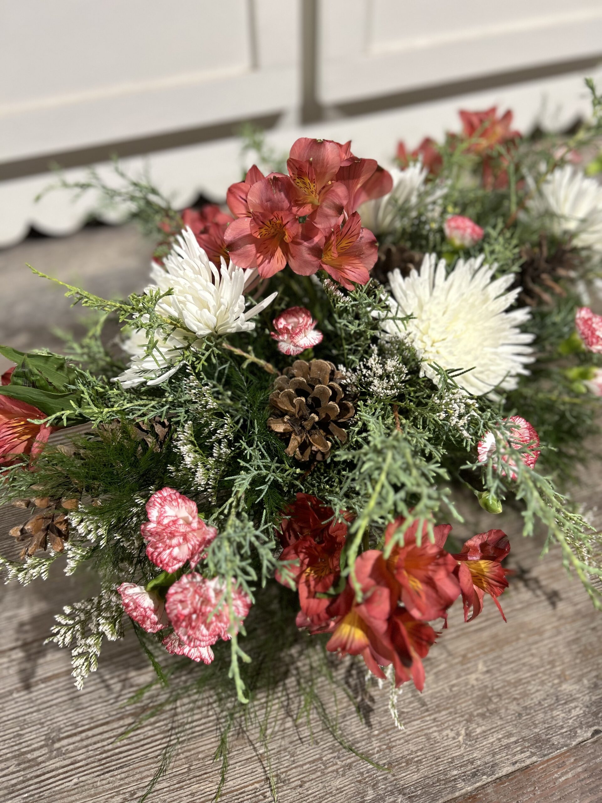 Create a warm and inviting atmosphere with the Winter Sunset Centerpiece. Featuring a festive design with elegant touches, this centerpiece is perfect for adding charm to any holiday table or seasonal decor. Its includes rich colors in the sunset-toned alstroemeria with bright pops of white spider cremones, polished with intricate details in the peppermint pixie carnations with pinecones nestled throughout . Ideal for enhancing your space with a touch of sophistication and warmth during the winter season.