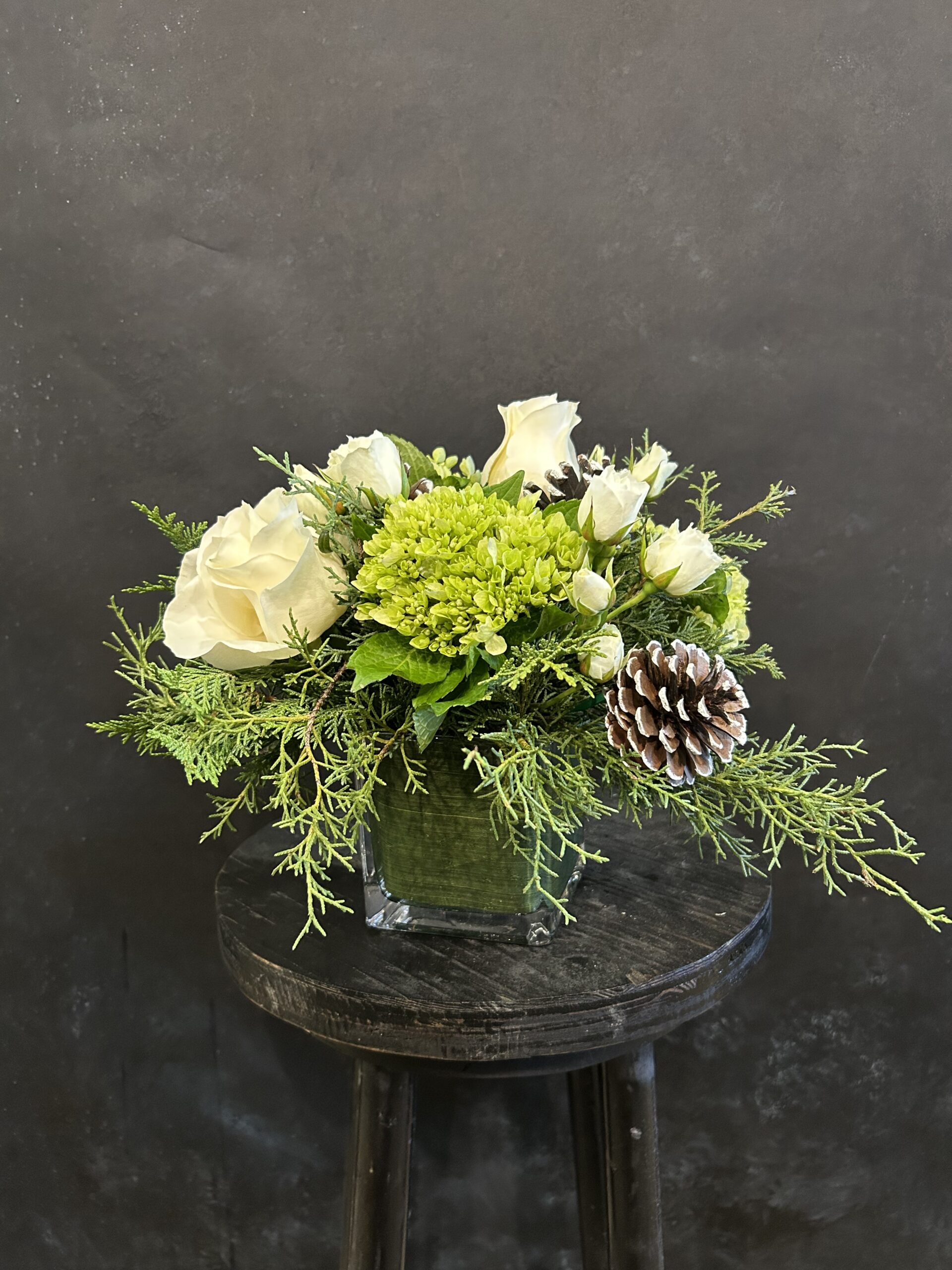 Capture the quiet beauty of the season with Winter Whites —a lush, low arrangement that evokes the stillness and charm of a snowy winter morning. Six white roses and delicate seasonal blooms mingle with fresh cedar, green hydrangea, and natural pine cones for texture and warmth. Designed in a round container, this arrangement blends crisp whites and soft greens into a timeless winter centerpiece—perfect for celebrating the season with elegance and grace.