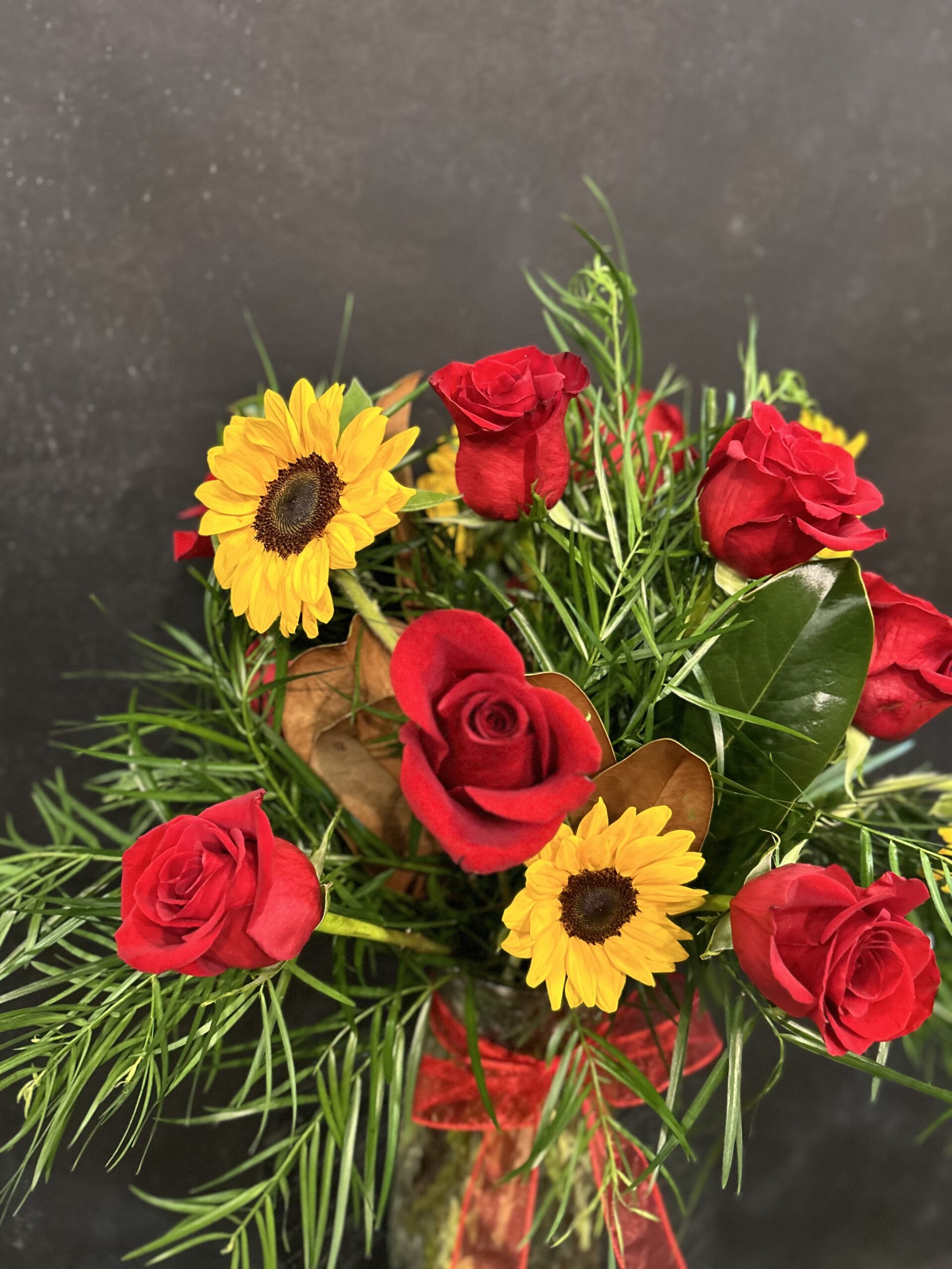 You Are My Sunshine is a striking, joy-filled arrangement that celebrates contrast and timeless beauty. A dozen classic red roses bring depth and romance, while a half dozen bright yellow sunflowers add instant warmth and happiness. Nestled into a lush base of velvety magnolia leaves and flowing weeping podocarpus, the design feels full, dramatic, and rich in texture. Large and bold in scale, this well-loved favorite is made to stand out—perfect for making a heartfelt statement that’s impossible to miss.